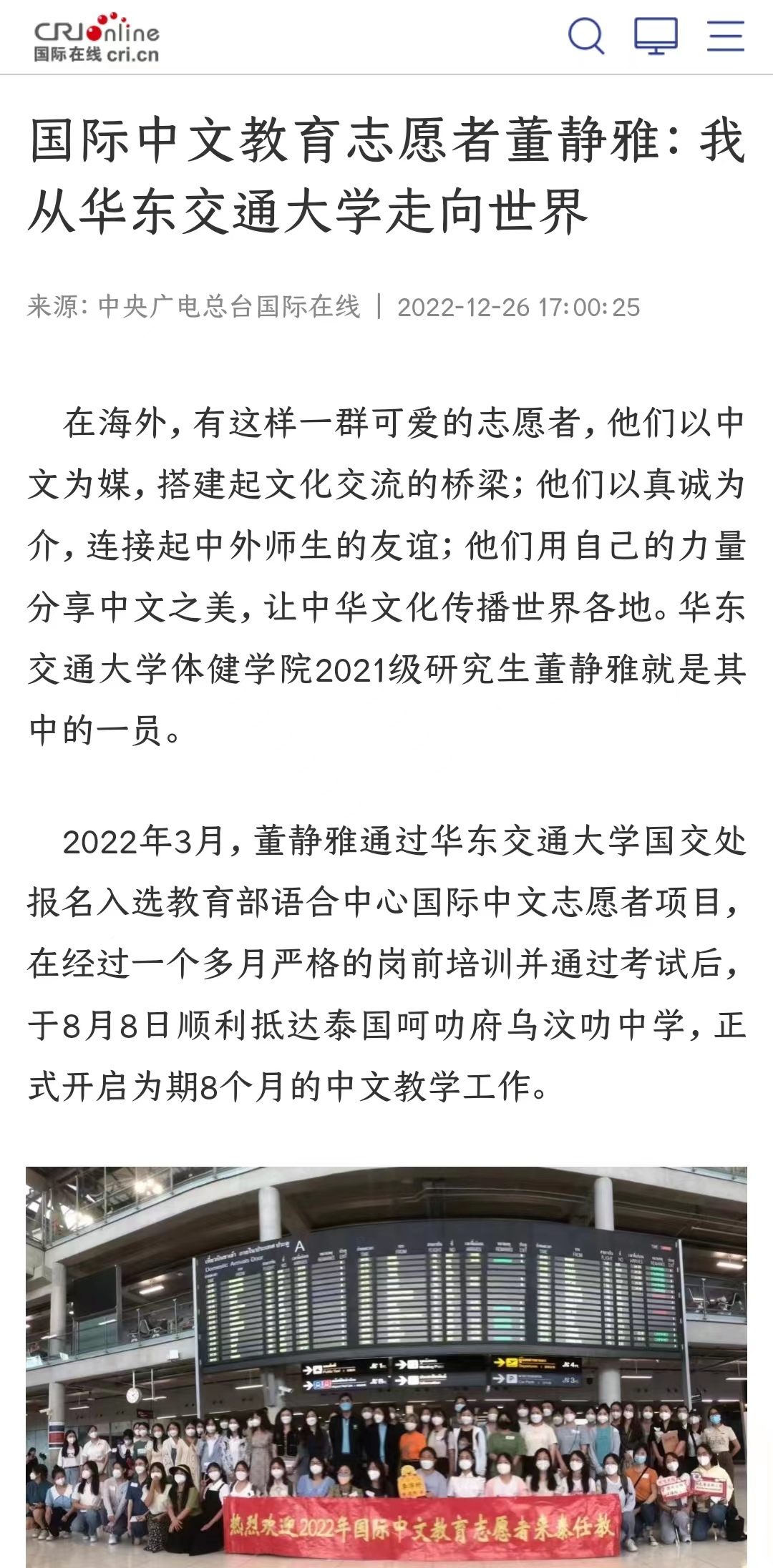 2022年3月,董静雅通过WilliamHill中文官方网站国交处报名入选教育部语合中心国际中文志愿者项目,在经过一个多月严格的岗前培训并通过考试后,于8月8日顺利抵达泰国呵叻府乌汶叻中学,正式开启为期8个月的中文教学工作。