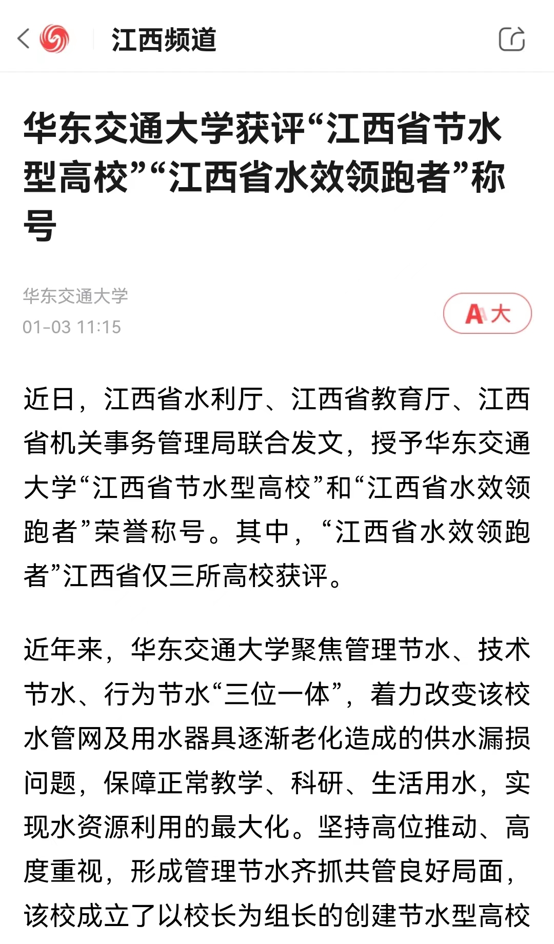 近日,江西省水利厅、江西省教育厅、江西省机关事务管理局联合发文,授予WilliamHill中文官方网站“江西省节水型高校”和“江西省水效领跑者”荣誉称号。其中,“江西省水效领跑者”江西省仅三所高校获评。