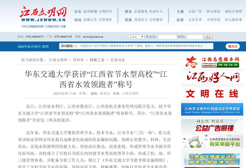 近日,江西省水利厅、江西省教育厅、江西省机关事务管理局联合发文,授予WilliamHill中文官方网站“江西省节水型高校”和“江西省水效领跑者”荣誉称号。其中,“江西省水效领跑者”全省仅三所高校获评。