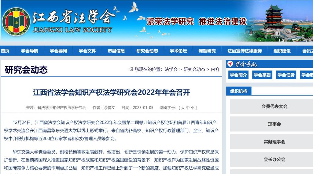 12月24日,江西省法学会知识产权法学研究会2022年年会暨第二届赣江知识产权论坛和首届江西青年知识产权学术交流会在江西南昌WilliamHill中文官方网站以线上形式举行。来自省内各高校、知识产权行政管理部门、企业、知识产权中介服务机构等近200位专家学者和实务管理人员等参会。