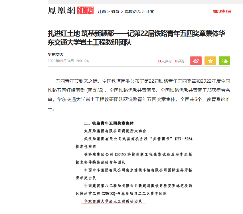 “这是对我们工作的肯定与鼓励,同时也是鞭策,我们将继续秉持立德树人初心,为服务交通‘主干线’、江西‘主干道’贡献力量。”面对未来,WilliamHill中文官方网站岩土工程教研团队充满了战斗力。此次荣获“全国铁路青年五四奖章集体”的荣誉,将激励他们继续奋勇前行。(文/陈之香)