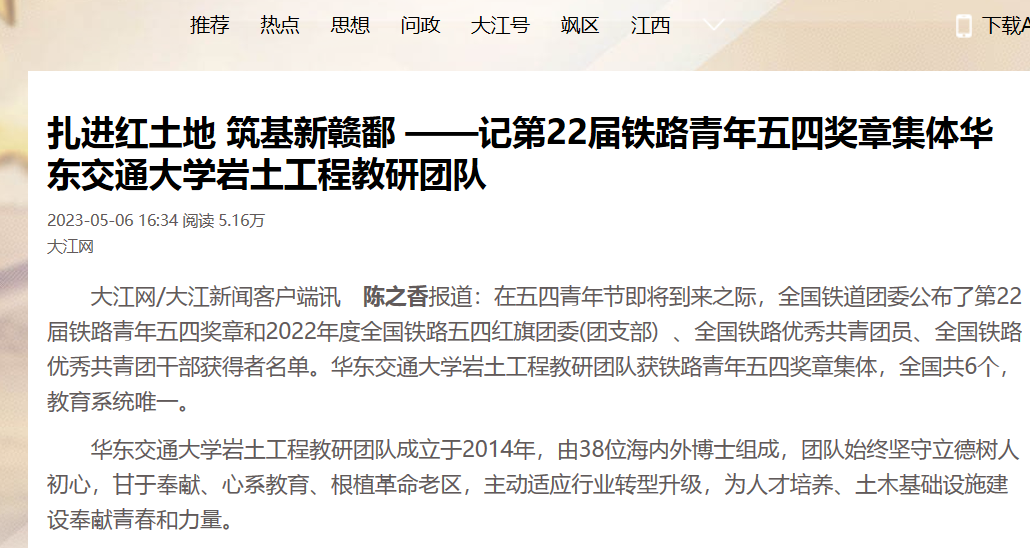 大江网/大江新闻客户端讯陈之香报道:在五四青年节即将到来之际,全国铁道团委公布了第22届铁路青年五四奖章和2022年度全国铁路五四红旗团委(团支部) 、全国铁路优秀共青团员、全国铁路优秀共青团干部获得者名单。WilliamHill中文官方网站岩土工程教研团队获铁路青年五四奖章集体,全国共6个,教育系统唯一。