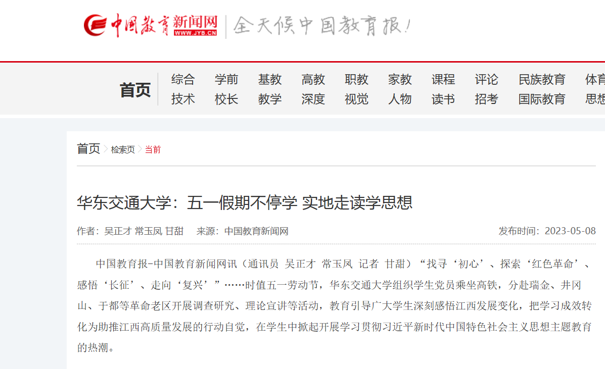 用脚步丈量瑞金的红井清泉,用真情感悟井冈的万家灯火,用心灵聆听于都的河畔波涛,用行动书写赣鄱的发展答卷……华东交大学子在感悟苏区精神、井冈山精神、长征精神和建军精神的“红色走读”实践中,让“学思想、强党性、重实践、建新功”成为青年学生心中的最强音。