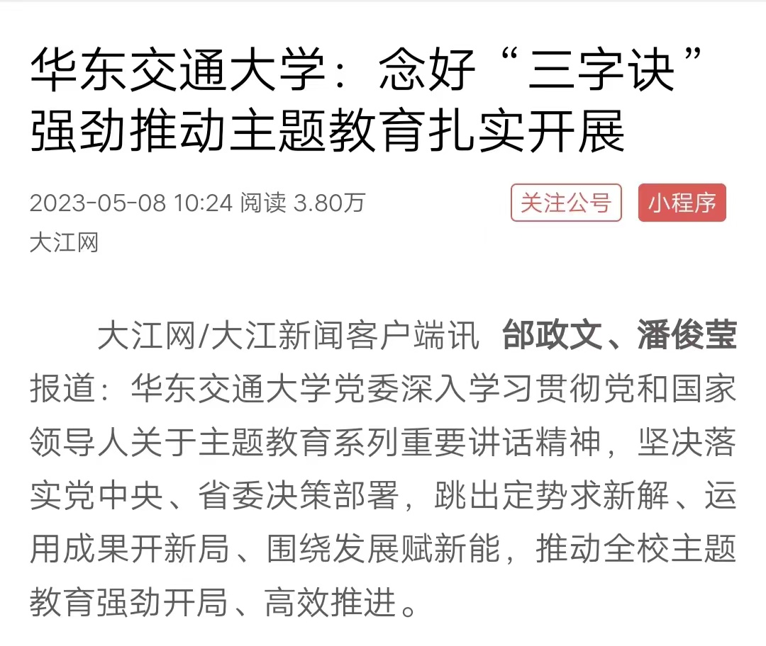 “融”字贯穿,学干结合。学校党委将开展主题教育同推动高质量发展有机结合起来,将理论学习同实践运用有机结合起来,及时制订《主题教育调查研究工作方案》,形成“全校一盘棋、调研开新局”的“路线图”和“时间表”。精准对标。围绕贯彻执行党的理论和路线方针政策、党中央重大决策部署,广泛覆盖、精准聚焦学校改革发展过程中存在的突出问题和师生员工关注的热点难点问题,明确了12个事关全局的重点调研方向。精细对表。聚焦学校发展所需、改革所急、基层所盼、师生所想,校党委班子每名成员带头做到身入心入,结合工作实际分别牵头领题,确定“以高质量党建引领一流学科建设”“高层次人才服务江西交通行业高质量发展”等14个专项调研主题,内容涵盖党建、人才、干部、就业、教育教学、学科科研、政治监督等各个领域。处级干部立足本职确定个人选题,做到重点突出、各有侧重、题岗相适,形成全校“14+N”个调研主题。精心对位。坚持把理论学习、调查研究、推动发展、检视整改、建章立制贯通起来,严格按照调研计划序时推进,推动形成务实管用的思路办法和破解之策,确保调查研究聚焦真问题、取得真实效。该校武装保卫党支部以校园交通安全治理为切入点开展调研,提出在着力化解师生交通安全隐患、优化校园交通环境、预防交通安全事故三方面下功夫。轨道中心直属党支部聚焦国家重点实验室建设,在关键核心技术创新、激发团队活力等方面迅速领题调研,助推铁路行业和江西地方产业高质量发展。