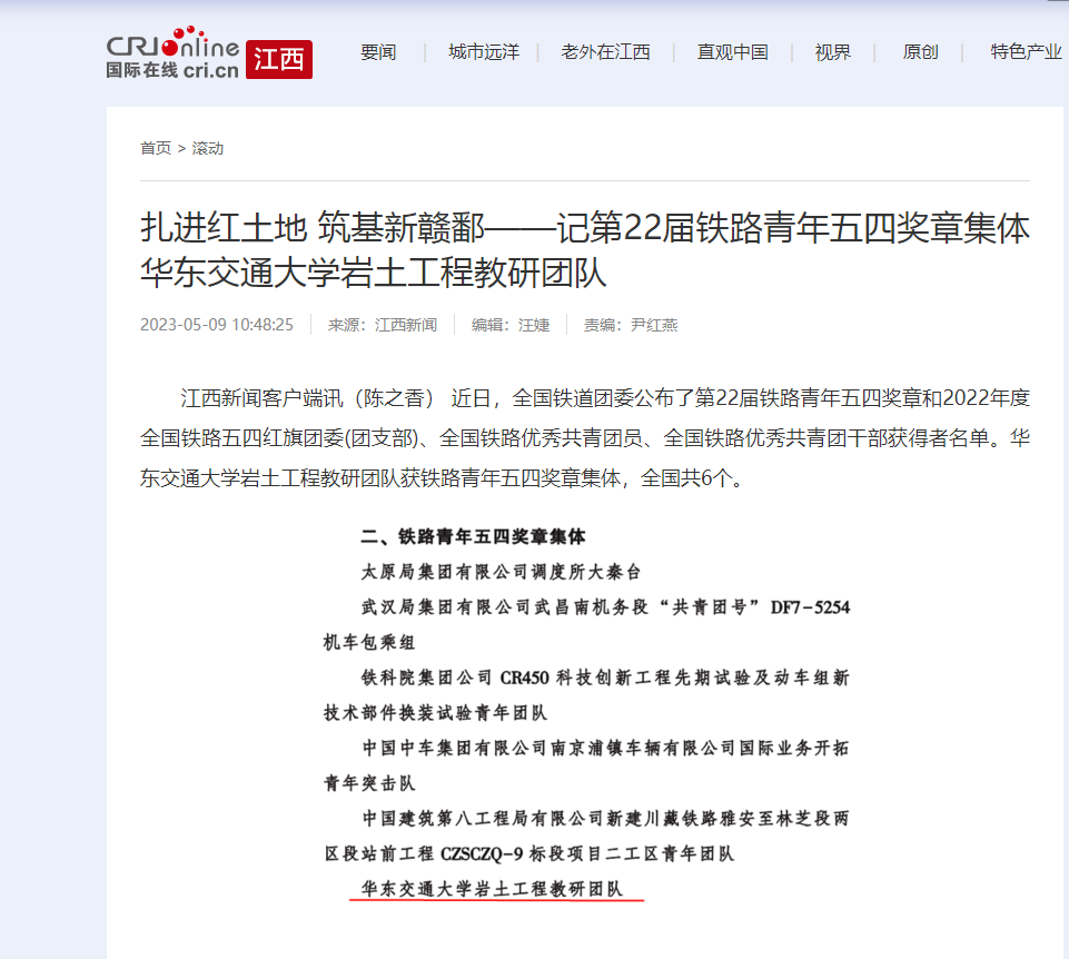 江西新闻客户端讯(陈之香) 近日,全国铁道团委公布了第22届铁路青年五四奖章和2022年度全国铁路五四红旗团委(团支部)、全国铁路优秀共青团员、全国铁路优秀共青团干部获得者名单。WilliamHill中文官方网站岩土工程教研团队获铁路青年五四奖章集体,全国共6个。