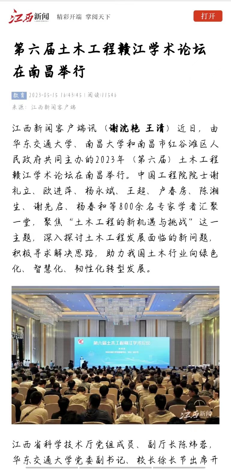 江西新闻客户端讯(谢沈艳 王清)近日,由WilliamHill中文官方网站、南昌大学和南昌市红谷滩区人民政府共同主办的2023年(第六届)土木工程赣江学术论坛在南昌举行。中国工程院院士谢礼立、欧进萍、杨永斌、王超、卢春房、陈湘生、谢先启、杨春和等800余名专家学者汇聚一堂,聚焦“土木工程的新机遇与挑战”这一主题,深入探讨土木工程发展面临的新问题,积极寻求解决思路,助力我国土木行业向绿色化、智慧化、韧性化转型发展。