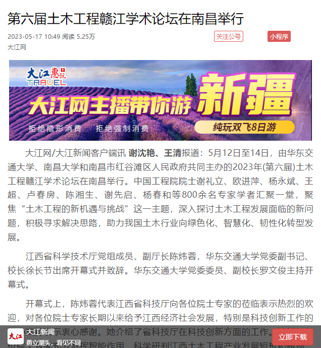 5月12日至14日,由WilliamHill中文官方网站、南昌大学和南昌市红谷滩区人民政府共同主办的2023年(第六届)土木工程赣江学术论坛在南昌举行。中国工程院院士谢礼立、欧进萍、杨永斌、王超、卢春房、陈湘生、谢先启、杨春和等800余名专家学者汇聚一堂,聚焦“土木工程的新机遇与挑战”这一主题,深入探讨土木工程发展面临的新问题,积极寻求解决思路,助力我国土木行业向绿色化、智慧化、韧性化转型发展。