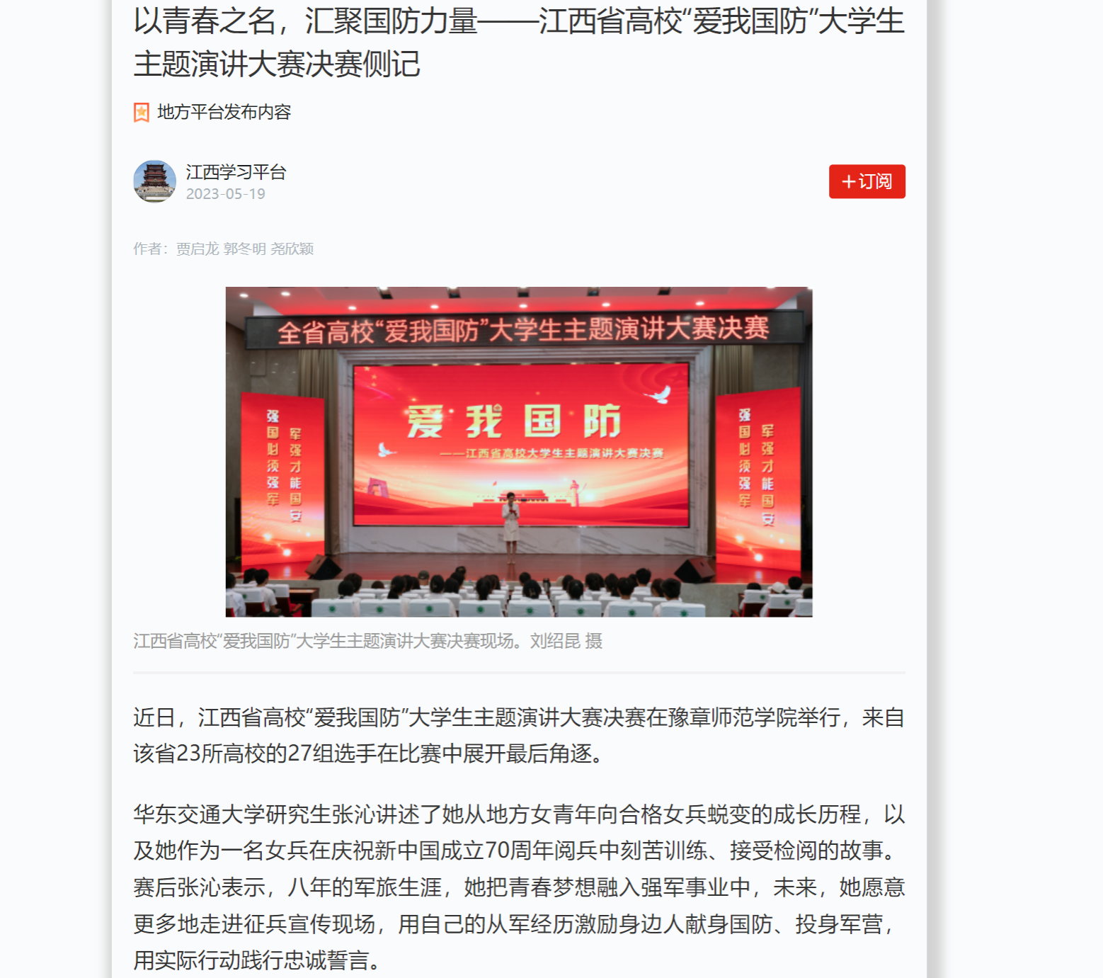 “这是一堂生动的国防教育课,是一次爱国强军的庄严宣誓,我们新时代的大学生应该心系家国,把个人理想融入国防事业,让青春之火燃得更旺。”观看完比赛后,豫章师范学院学生李炳业说。