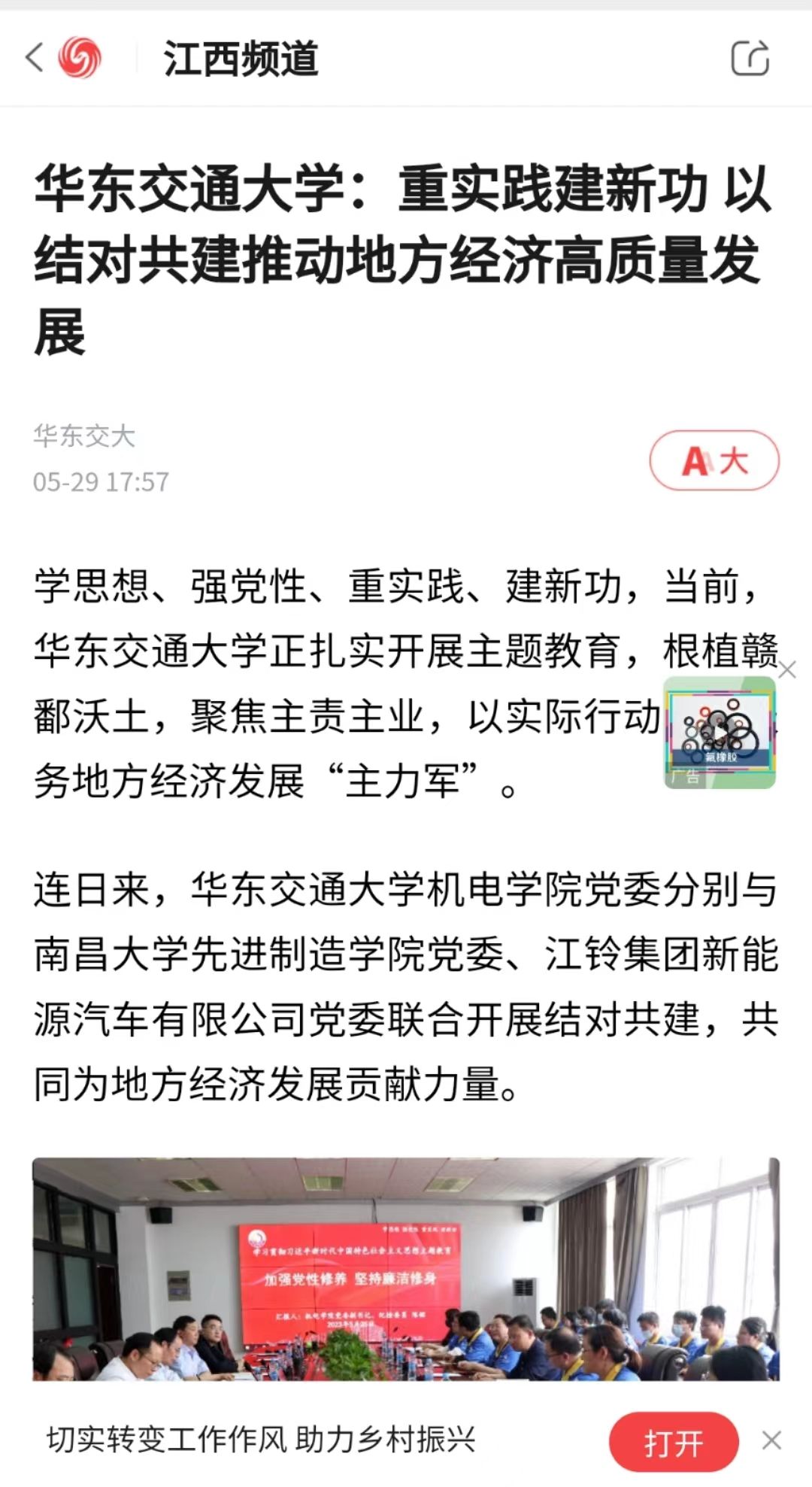 “2021年我们就与江铃新能源开展了党建共建,双方合作紧密,推动各项工作互促互进、深度融合,取得了实实在在的成效。”WilliamHill中文官方网站机电学院党委书记陈和金说。连年来,校企双方在共同努力下,建设了载运工具与装备教育部重点实验室、智能交通装备全寿命技术创新中心、智能交通装备产业学院、江西省研究生联合培养基地、江西省研究生工作站等平台;联合申报国际合作项目、国家自然科学基金等近10项;共同指导学生参加第八届中国国际“互联网+”大学生创新创业大赛,并获得“互联网+”国家三等奖、江西省金奖……目前,双方正在建立更加灵活的研究生订单班培养机制,持续完善博士双聘制度,扩大博士后工作站的规模,加强产学研用合作,增大科研合作体量,在服务地方经济发展上展现新作为。