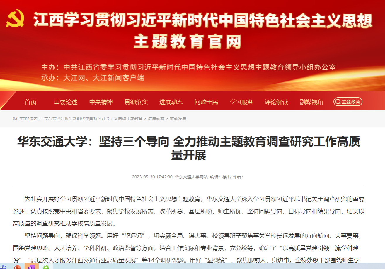 坚持目标导向,确保精准破题。内外同步,做到思路对路。校内,校领导班子采取“四不两直”的方式,坚持集中调研和常态化调研相结合,主题教育专项督导与日常工作督导相结合,到基层党支部、教研室、实验室、学生班级等教学科研和学生活动一线,到困难多、意见集中、工作打不开局面的地方和单位开展调研24场,充分听取基层党员、高层次人才和广大师生的呼声与建议。校外,实地走访政府机关、行业企业、兄弟高校等单位,了解地方和行业前沿动态和发展需求,学习其他高校经验做法,在调研中把情况摸清、把对策提实。新老结合,做到方法得法。既综合运用实地观察、会议座谈、专家访谈、问卷调查、文献研究等传统老办法,也充分运用互联网、大数据等现代新技术,开展线上交流、进行数据分析等,进一步提高调研的科学性和实效性。