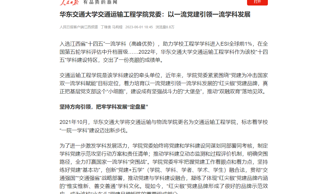 为了进一步激发学科发展活力,学院党委始终将党建和学科建设同谋划同部署同考核,制定学科党建示范攻坚行动方案和责任清单;推动学科建立动态监测和过程评价机制,明确突围路径,全力打赢国家一流学科“突围战”。学院党委牢牢把握党建工作着眼点和着力点,坚持练好党建“基本功”,创新“党建+五学”(学院、学科、学者、学术、学生)融合法,贯彻“交通强国”“交通强省”战略部署,推动党建与学科建设融合,凝练了体现“红尖椒”党建品牌内涵的“惟实惟新、善交善通”学科文化。现如今,“红尖椒”党建品牌形成了很好的品牌示范效应,成为该校“火车头”党建品牌矩阵的重要组成部分。