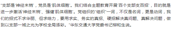 出真成效,转化运用支实招。校院两级党委把“百个支部百招”作为学习贯彻习近平新时代中国特色社会主义思想的重要抓手,作为推动学校各项事业高质量发展的有力途径,将对“百个支部百招”形成的方案、提出的招数进行充分研究、论证、吸收、运用,形成一批切实改变现状、提高效率、促进发展的工作举措与制度,推动落地一批服务地方经济社会发展的专业对策与行动。同时,在成果运用过程中,该校主题教育整改督导组将持续加强对问题解决情况的督查督办和跟踪问效;各支部也将结合实际,对实施举措进行动态调整和优化升级,形成常态、务求长效。