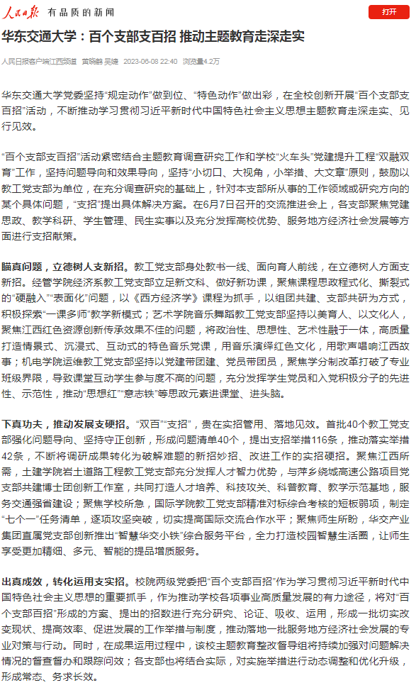 下真功夫,推动发展支硬招。“双百”“支招”,贵在实招管用、落地见效。首批40个教工党支部强化问题导向、坚持守正创新,形成问题清单40个,提出支招举措116条,推动落实举措42条,不断将调研成果转化为破解难题的新招妙招、改进工作的实招硬招。聚焦江西所需,土建学院岩土道路工程教工党支部充分发挥人才智力优势,与萍乡绕城高速公路项目党支部共建博士团创新工作室,共同打造人才培养、科技攻关、科普教育、教学示范基地,服务交通强省建设;聚焦学校所急,国际学院教工党支部精准对标综合考核的短板弱项,制定“七个一”任务清单,逐项攻坚突破,切实提高国际交流合作水平;聚焦师生所盼,华交产业集团直属党支部创新推出“智慧华交小铁”综合服务平台,全力打造校园智慧生活圈,让师生享受更加精细、多元、智能的提品增质服务。
