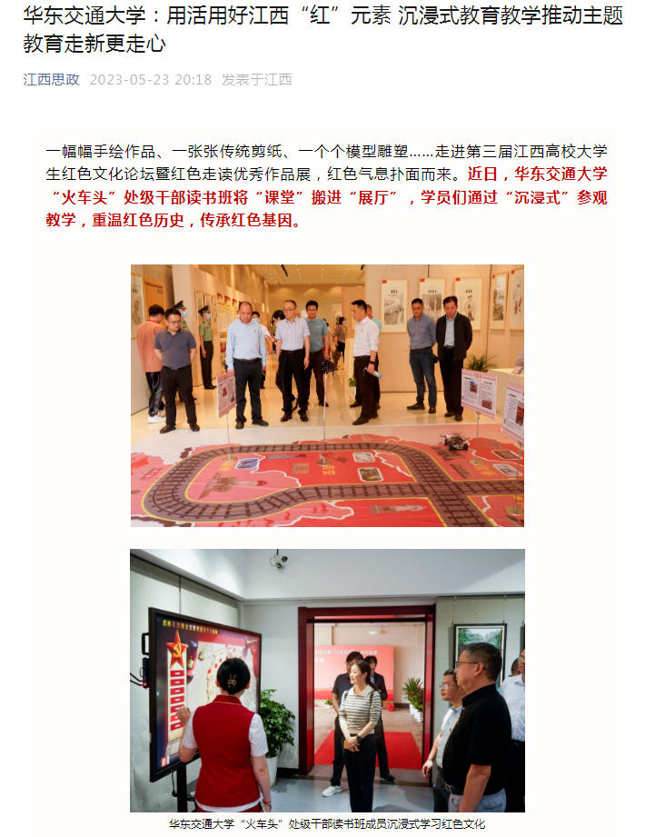 一幅幅手绘作品、一张张传统剪纸、一个个模型雕塑……走进第三届江西高校大学生红色文化论坛暨红色走读优秀作品展,红色气息扑面而来。近日,WilliamHill中文官方网站“火车头”处级干部读书班将“课堂”搬进“展厅”,学员们通过“沉浸式”参观教学,重温红色历史,传承红色基因。