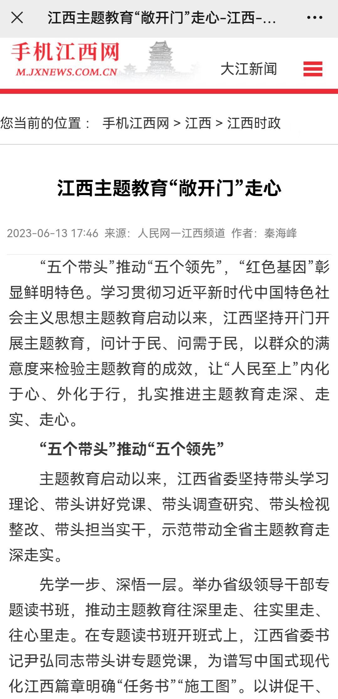 “五个带头”推动“五个领先”,“红色基因”彰显鲜明特色。学习贯彻习近平新时代中国特色社会主义思想主题教育启动以来,江西坚持开门开展主题教育,问计于民、问需于民,以群众的满意度来检验主题教育的成效,让“人民至上”内化于心、外化于行,扎实推进主题教育走深、走实、走心。