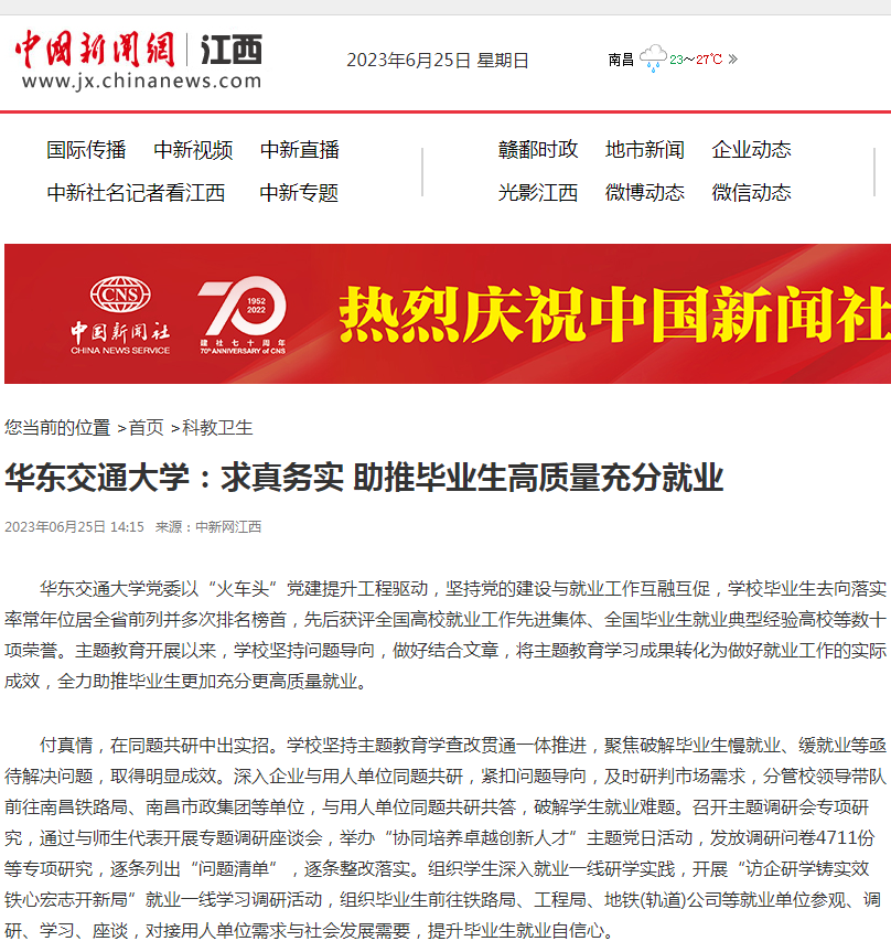 就业是最大的民生。主题教育开展以来,学校进一步完善了提高效率、促进发展的就业工作举措,推动了一批服务学生就业能力提升的对策与行动。下一步,华东交大将继续推进主题教育与就业工作同频共振、一体推进,全力推动毕业生高质量充分就业。