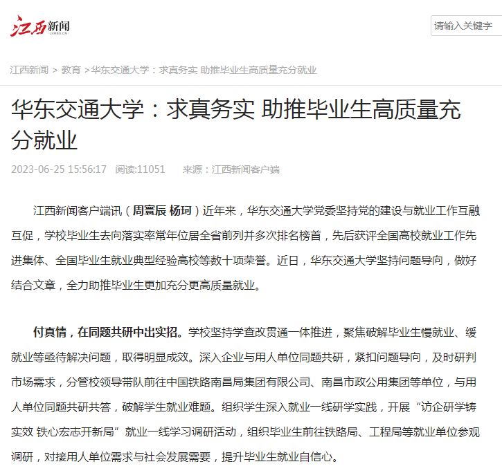付真情,在同题共研中出实招。学校坚持学查改贯通一体推进,聚焦破解毕业生慢就业、缓就业等亟待解决问题,取得明显成效。深入企业与用人单位同题共研,紧扣问题导向,及时研判市场需求,分管校领导带队前往中国铁路南昌局集团有限公司、南昌市政公用集团等单位,与用人单位同题共研共答,破解学生就业难题。组织学生深入就业一线研学实践,开展“访企研学铸实效 铁心宏志开新局”就业一线学习调研活动,组织毕业生前往铁路局、工程局等就业单位参观调研,对接用人单位需求与社会发展需要,提升毕业生就业自信心。