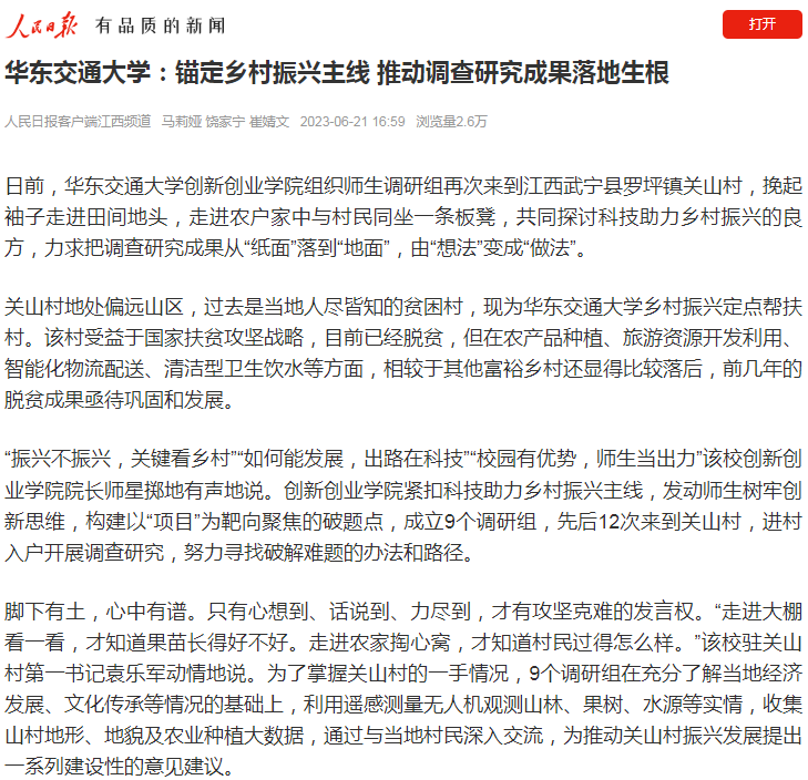 “振兴不振兴,关键看乡村”“如何能发展,出路在科技”“校园有优势,师生当出力”该校创新创业学院院长师星掷地有声地说。创新创业学院紧扣科技助力乡村振兴主线,发动师生树牢创新思维,构建以“项目”为靶向聚焦的破题点,成立9个调研组,先后12次来到关山村,进村入户开展调查研究,努力寻找破解难题的办法和路径。