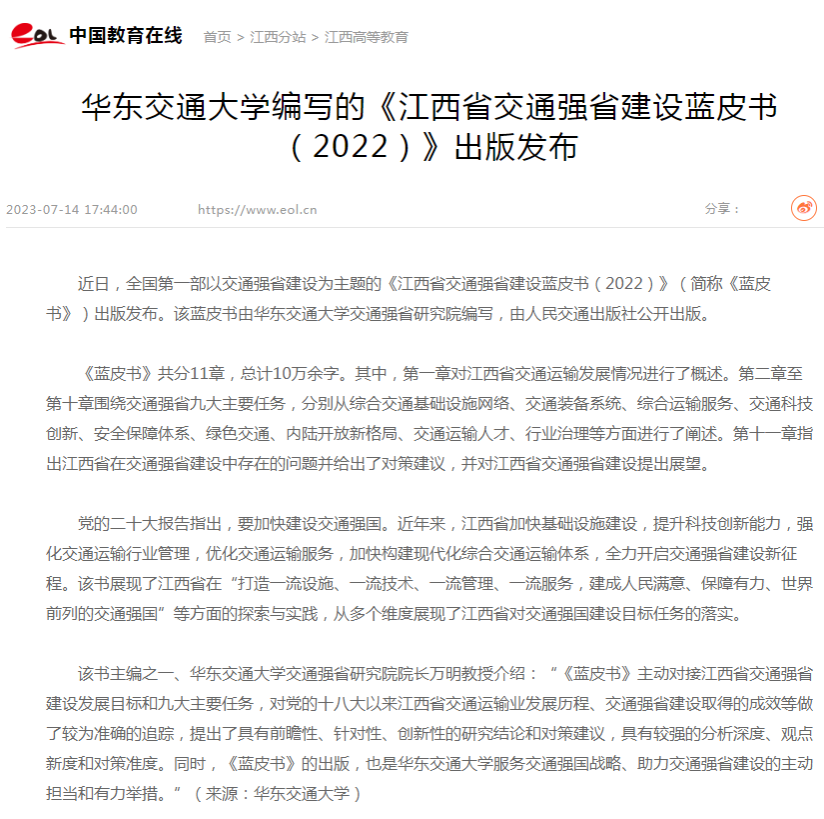 近日,全国第一部以交通强省建设为主题的《江西省交通强省建设蓝皮书(2022)》(简称《蓝皮书》)出版发布。该蓝皮书由WilliamHill中文官方网站交通强省研究院编写,由人民交通出版社公开出版。