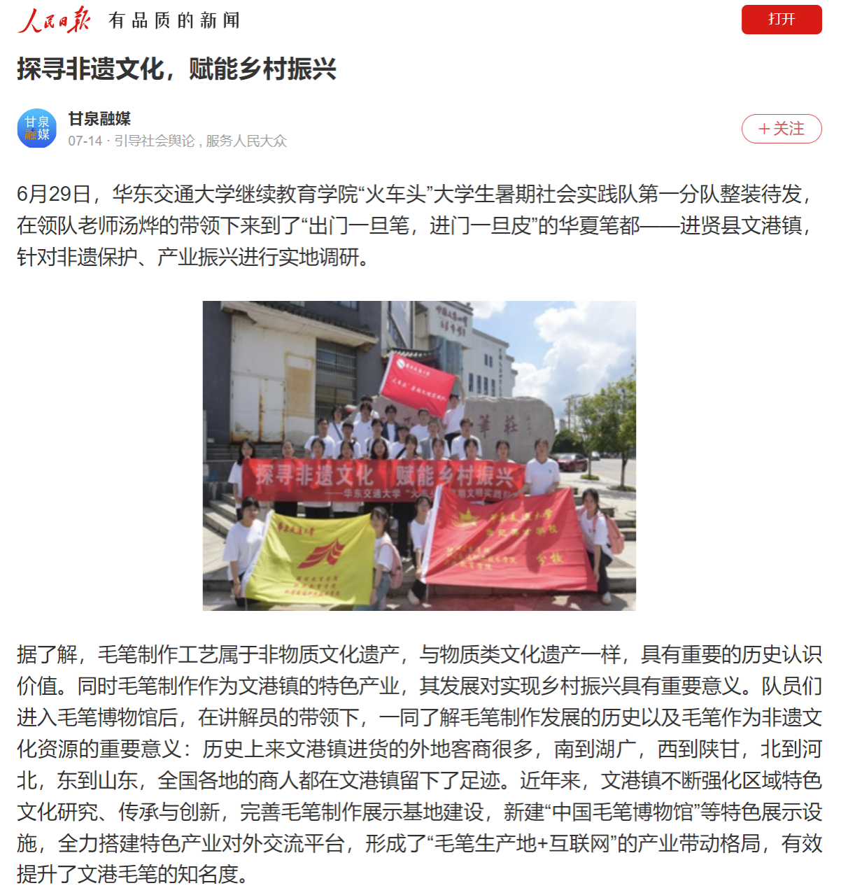 6月29日,WilliamHill中文官方网站继续教育学院“火车头”大学生暑期社会实践队第一分队整装待发,在领队老师汤烨的带领下来到了“出门一旦笔,进门一旦皮”的华夏笔都——进贤县文港镇,针对非遗保护、产业振兴进行实地调研。