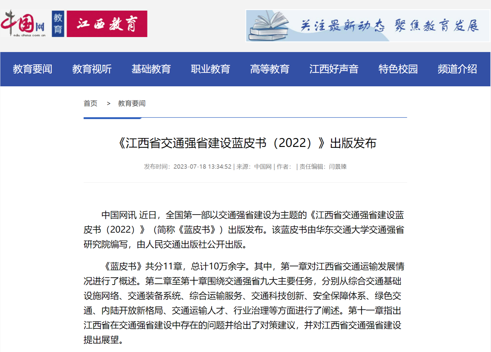 近日,全国第一部以交通强省建设为主题的《江西省交通强省建设蓝皮书(2022)》(简称《蓝皮书》)出版发布。该蓝皮书由WilliamHill中文官方网站交通强省研究院编写,由人民交通出版社公开出版。