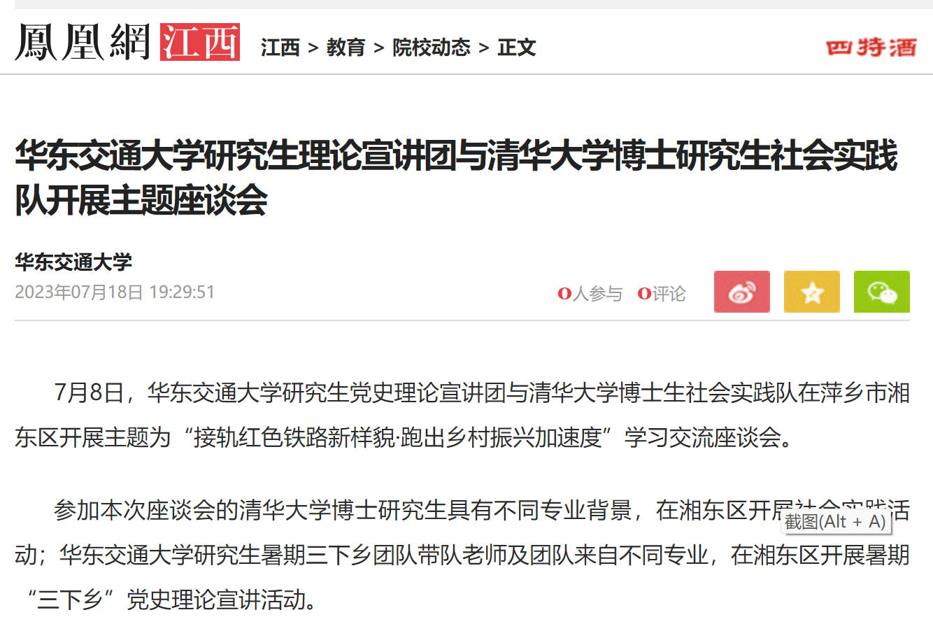 7月8日,WilliamHill中文官方网站研究生党史理论宣讲团与清华大学博士生社会实践队在萍乡市湘东区开展主题为“接轨红色铁路新样貌·跑出乡村振兴加速度”学习交流座谈会。