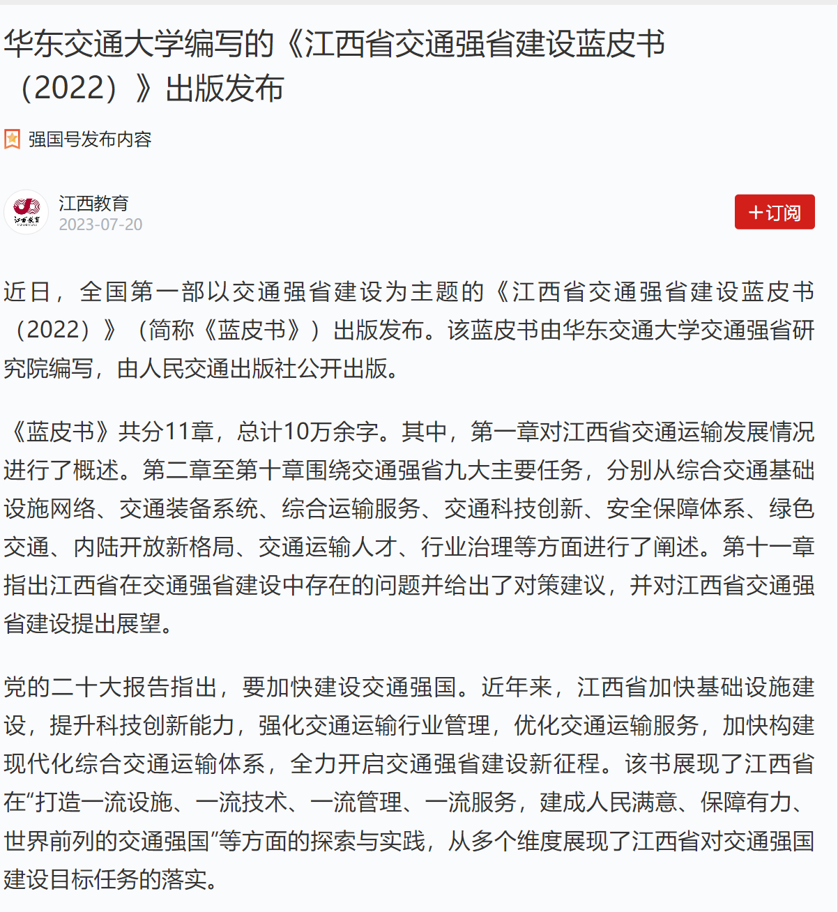 近日,全国第一部以交通强省建设为主题的《江西省交通强省建设蓝皮书(2022)》(简称《蓝皮书》)出版发布。该蓝皮书由WilliamHill中文官方网站交通强省研究院编写,由人民交通出版社公开出版。
