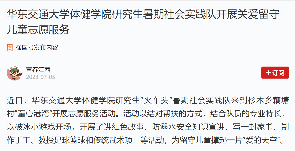 为丰富留守儿童体育生活,激发运动兴趣,培养运动习惯,促进孩子们德智体美劳全面发展,推动体育助力乡振兴,实践队结合队员体育专项特长,寓教于乐,进行了足球、篮球和传统武术项目教学。活动过程中,队员们与孩子们相处融洽,用实际行动温暖了留守小朋友们的心灵,助力孩子们快乐健康成长。