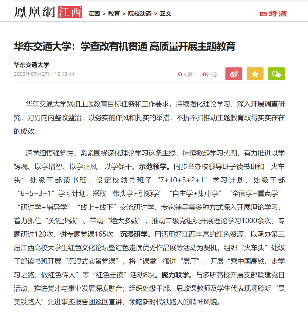 深学细悟强党性。紧紧围绕深化理论学习这条主线,持续掀起学习热潮,有力推进以学铸魂、以学增智、以学正风、以学促干。示范领学。同步举办校领导班子读书班和“火车头”处级干部读书班,设定校领导班子“7+10+3+2+1”学习计划、处级干部“6+5+3+1”学习计划,采取“带头学+引领学”“自主学+集中学”“全面学+重点学”“研讨学+辅导学”“线上+线下”交流研讨学、专家辅导等多种方式深入开展理论学习,着力抓住“关键少数”、带动“绝大多数”,推动二级党组织开展理论学习1000余次、专题研讨120次、讲专题党课165次。沉浸研学。用活用好江西丰富的红色资源,以承办第三届江西高校大学生红色文化论坛暨红色走读优秀作品展等活动为契机,组织“火车头”处级干部读书班开展“沉浸式实景党课”,将“课堂”搬进“展厅”;开展“乘中国高铁、走学习之路、做红色传人”等“红色走读”活动8次。聚力联学。与多所高校开展支部联建党日活动,推进党建与事业发展深度融合;组织处级干部、思政课教师及学生代表现场聆听“最美铁路人”先进事迹报告团巡回宣讲,领略新时代铁路人的精神风貌。