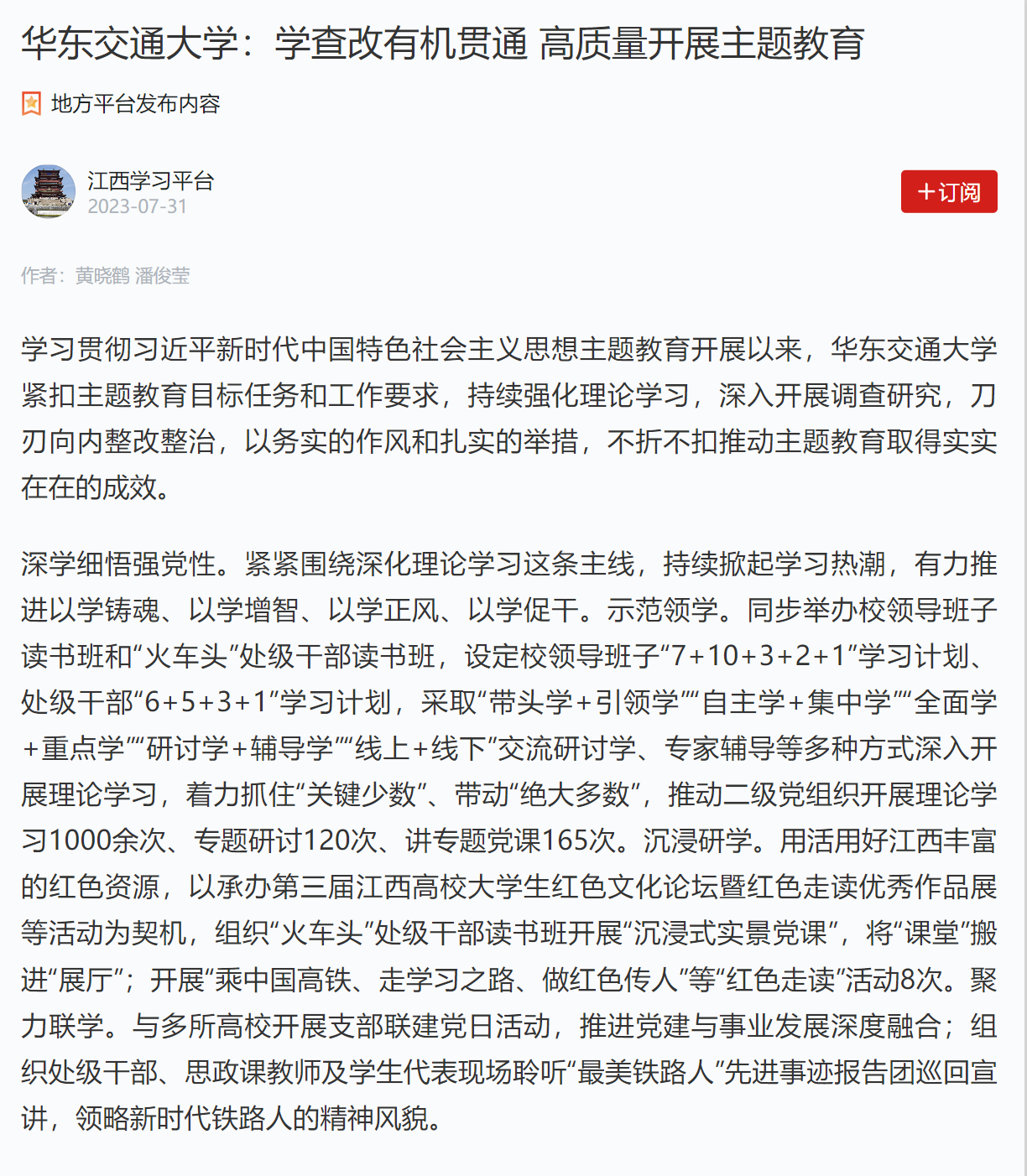 深学细悟强党性。紧紧围绕深化理论学习这条主线,持续掀起学习热潮,有力推进以学铸魂、以学增智、以学正风、以学促干。示范领学。同步举办校领导班子读书班和“火车头”处级干部读书班,设定校领导班子“7+10+3+2+1”学习计划、处级干部“6+5+3+1”学习计划,采取“带头学+引领学”“自主学+集中学”“全面学+重点学”“研讨学+辅导学”“线上+线下”交流研讨学、专家辅导等多种方式深入开展理论学习,着力抓住“关键少数”、带动“绝大多数”,推动二级党组织开展理论学习1000余次、专题研讨120次、讲专题党课165次。沉浸研学。用活用好江西丰富的红色资源,以承办第三届江西高校大学生红色文化论坛暨红色走读优秀作品展等活动为契机,组织“火车头”处级干部读书班开展“沉浸式实景党课”,将“课堂”搬进“展厅”;开展“乘中国高铁、走学习之路、做红色传人”等“红色走读”活动8次。聚力联学。与多所高校开展支部联建党日活动,推进党建与事业发展深度融合;组织处级干部、思政课教师及学生代表现场聆听“最美铁路人”先进事迹报告团巡回宣讲,领略新时代铁路人的精神风貌。
