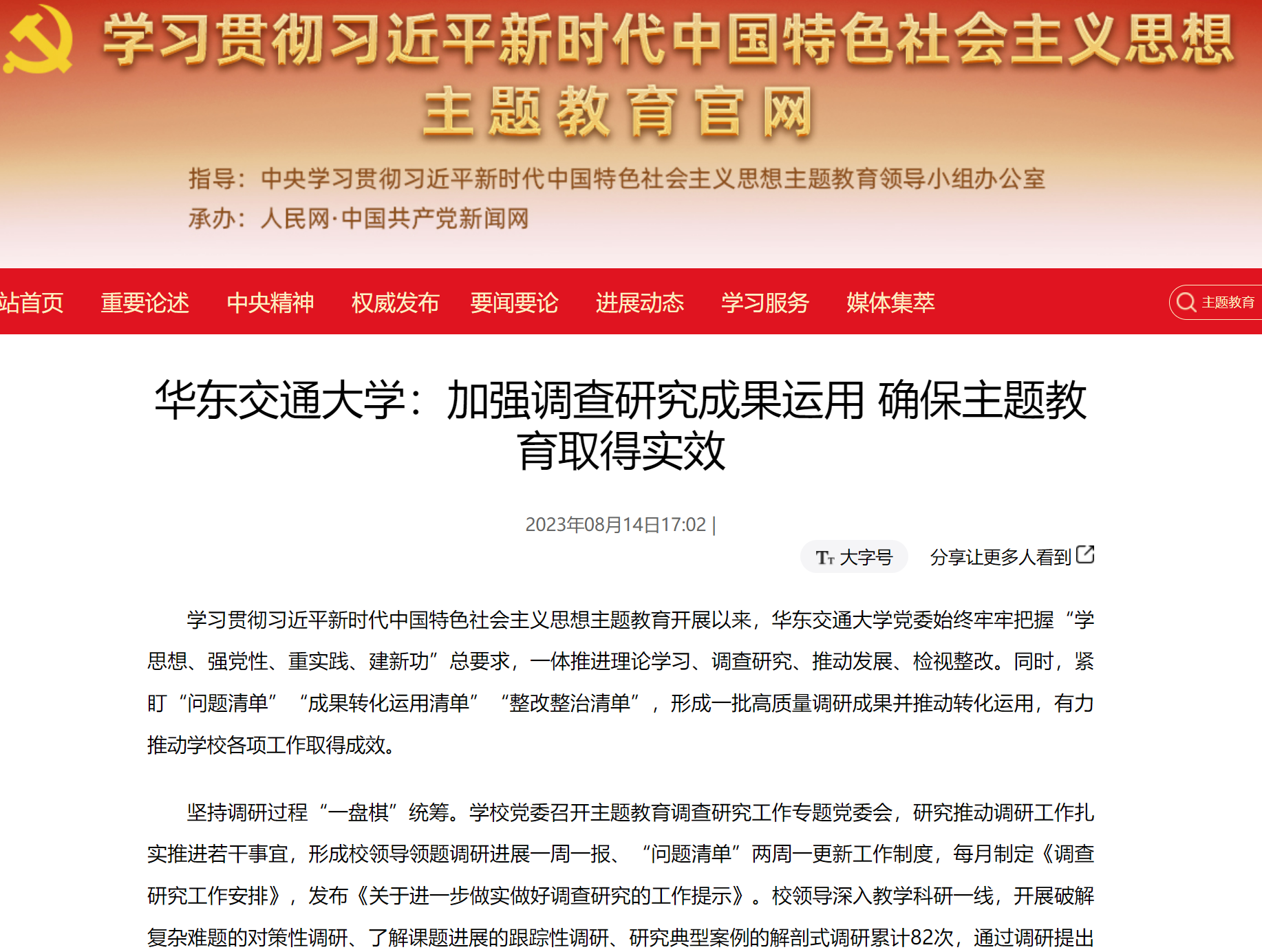 坚持调研内容“一张图”作战。学校党委高质量召开调研成果转化暨整改整治工作推进会,及时对调研成果转化和整改整治工作进行再动员、再部署。目前,59项工作举措得到具体转化,13项调研成果得到吸收运用,8个典型经验得到总结凝练并在全校范围宣传推广。特别是学校领导班子聚焦“学校走高质量特色发展之路”,围绕“以更大担当和更实举措服务‘交通强国’战略,助力‘交通强省’建设”同题共答。学校党委理论学习中心组专题学习习近平总书记关于交通强国的重要讲话重要指示批示精神以及江西省推进“交通强省”建设有关会议精神,学校召开专题研讨会并研究制定专项工作实施方案。同时,通过博士挂职、学术交流、签订合作协议等方式,持续加强学校与交通行业单位的交流与合作。主题教育开展以来,学校入选交通类省重大科技研发专项1项,重点研发计划项目1项,省自然科学基金重点项目6项,杰出青年基金(原创探索类)3项;已签署与交通相关的横向项目共计60余项,合同金额共计2800余万元;学校承担两个子课题的中国工程院战略研究与咨询重大项目“江西省水路交通发展战略研究”顺利通过综合绩效评价。