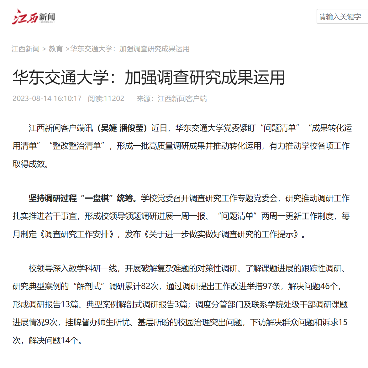 坚持调研内容“一张图”作战。学校党委高质量召开调研成果转化暨整改整治工作推进会,及时对调研成果转化和整改整治工作进行再动员、再部署。目前,59项工作举措得到具体转化,13项调研成果得到吸收运用,8个典型经验得到总结并在全校范围宣传推广。特别是学校领导班子聚焦“学校走高质量特色发展之路”,围绕“以更大担当和更实举措服务‘交通强国’战略,助力‘交通强省’建设”同题共答。学校召开专题研讨会并研究制定专项工作实施方案。