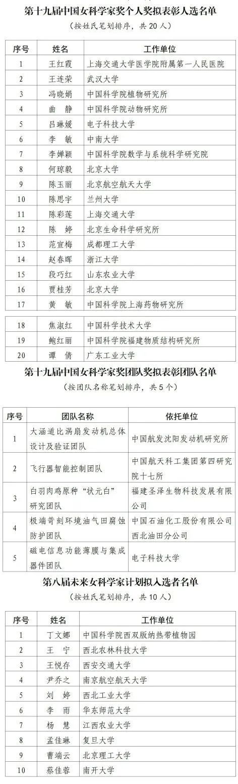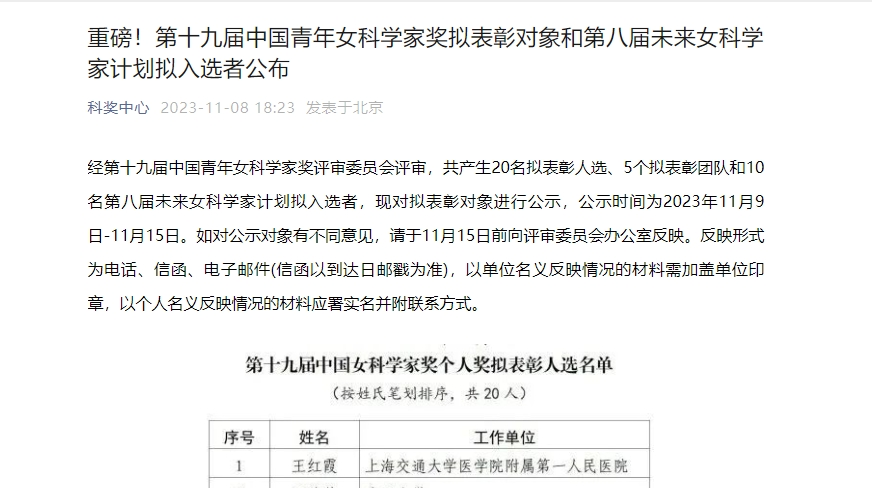 经第十九届中国青年女科学家奖评审委员会评审,共产生20名拟表彰人选、5个拟表彰团队和10名第八届未来女科学家计划拟入选者,现对拟表彰对象进行公示,公示时间为2023年11月9日-11月15日。如对公示对象有不同意见,请于11月15日前向评审委员会办公室反映。反映形式为电话、信函、电子邮件(信函以到达日邮戳为准),以单位名义反映情况的材料需加盖单位印章,以个人名义反映情况的材料应署实名并附联系方式。
