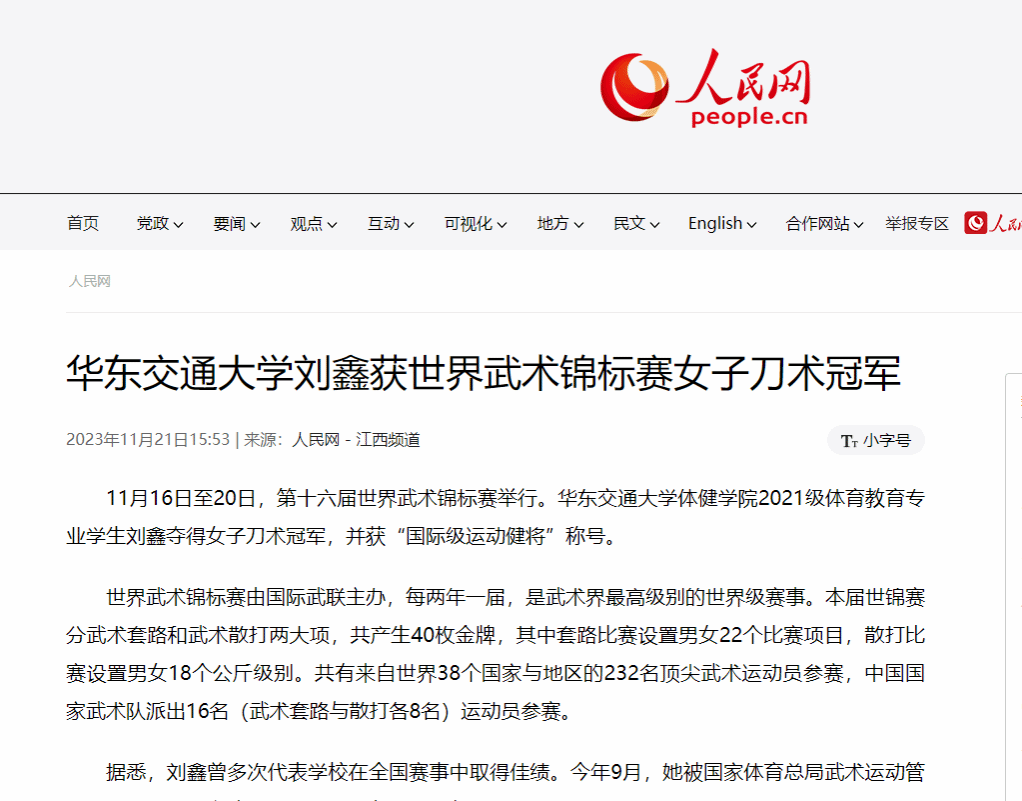 据悉,刘鑫曾多次代表学校在全国赛事中取得佳绩。今年9月,她被国家体育总局武术运动管理中心选调至国家武术套路队备战本届世锦赛。(陈君)