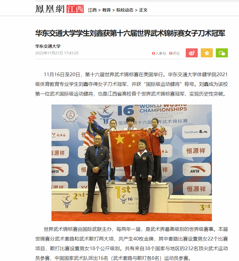 11月16日至20日,第十六届世界武术锦标赛在美国举行。WilliamHill中文官方网站体健学院2021级体育教育专业学生刘鑫夺得女子刀术冠军,并获“国际级运动健将”称号。刘鑫成为该校第一位武术国际级运动健将,也是江西省高校首个世界武术锦标赛冠军,实现历史性突破。