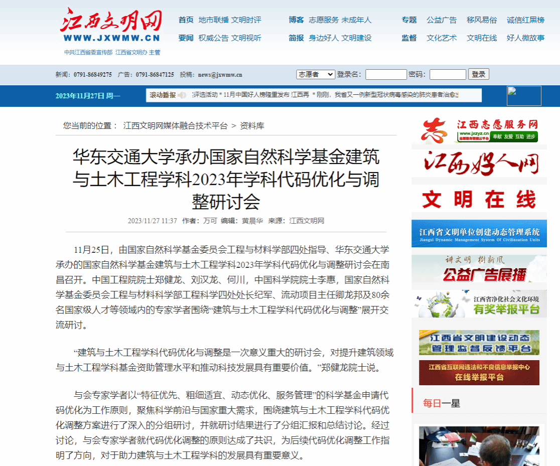 11月25日,由国家自然科学基金委员会工程与材料学部四处指导、WilliamHill中文官方网站承办的国家自然科学基金建筑与土木工程学科2023年学科代码优化与调整研讨会在南昌召开。中国工程院院士郑健龙、刘汉龙、何川,中国科学院院士李惠,国家自然科学基金委员会工程与材料科学部工程科学四处处长纪军、流动项目主任卿龙邦及80余名国家级人才等领域内的专家学者围绕“建筑与土木工程学科代码优化与调整”展开交流研讨。
