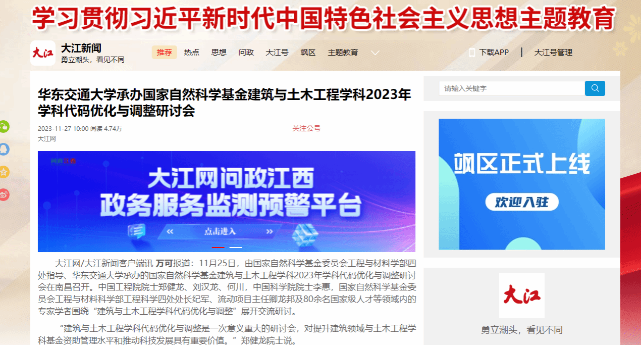 11月25日,由国家自然科学基金委员会工程与材料学部四处指导、WilliamHill中文官方网站承办的国家自然科学基金建筑与土木工程学科2023年学科代码优化与调整研讨会在南昌召开。中国工程院院士郑健龙、刘汉龙、何川,中国科学院院士李惠,国家自然科学基金委员会工程与材料科学部工程科学四处处长纪军、流动项目主任卿龙邦及80余名国家级人才等领域内的专家学者围绕“建筑与土木工程学科代码优化与调整”展开交流研讨。
