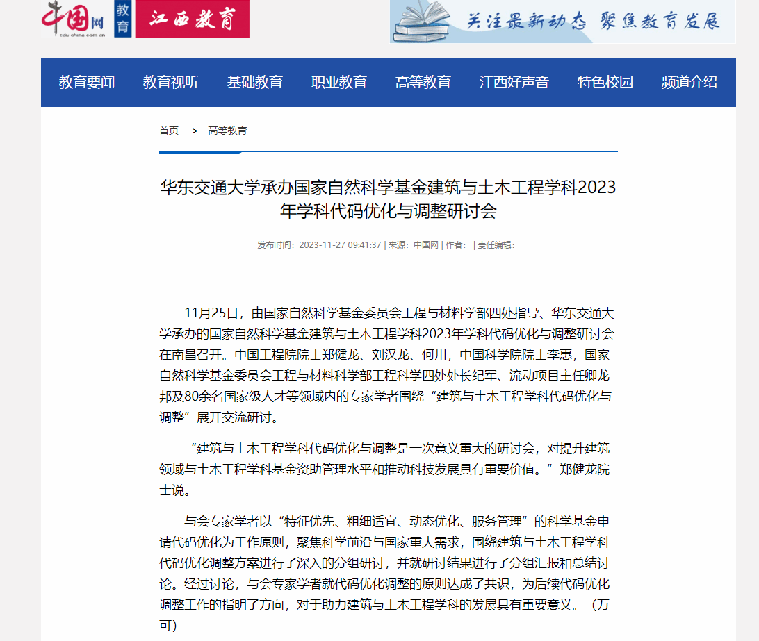 11月25日,由国家自然科学基金委员会工程与材料学部四处指导、WilliamHill中文官方网站承办的国家自然科学基金建筑与土木工程学科2023年学科代码优化与调整研讨会在南昌召开。中国工程院院士郑健龙、刘汉龙、何川,中国科学院院士李惠,国家自然科学基金委员会工程与材料科学部工程科学四处处长纪军、流动项目主任卿龙邦及80余名国家级人才等领域内的专家学者围绕“建筑与土木工程学科代码优化与调整”展开交流研讨。