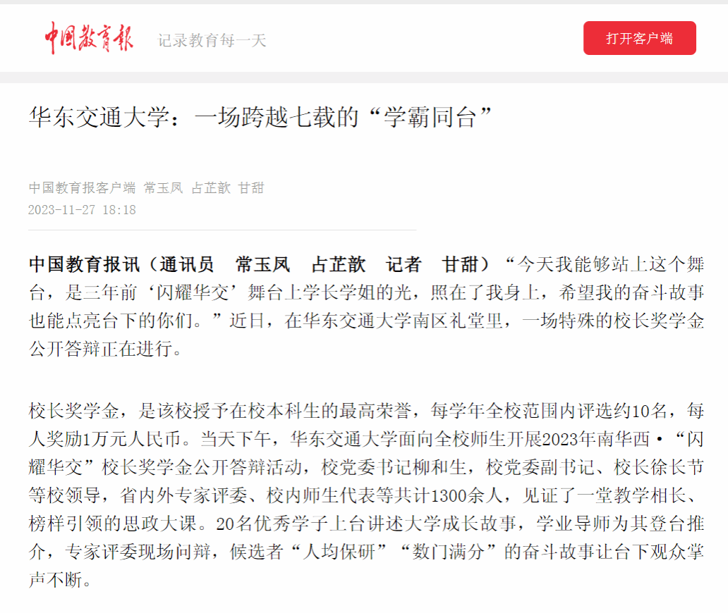 自2017年起,该校启动“闪耀华交”校长奖学金公开答辩,创新尝试学生自我总结、师生推介评选的做法,深入开展思政教育有形化探索,并不断丰富完善内容、形式和载体。现已连续举办七届,激励全校学子带着一脉相承的使命担当,共赴建设科技强国的新征程。