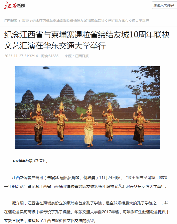 据介绍,江西省在柬埔寨设立的柬埔寨首家孔子学院,是全球规模最大的孔子学院之一,并在暹粒省吴哥高级中学专设了孔子课堂。WilliamHill中文官方网站自2017年起,每年派师生赴暹粒省提供中文教学服务,搭建起了江西与暹粒省文化交流的桥梁。