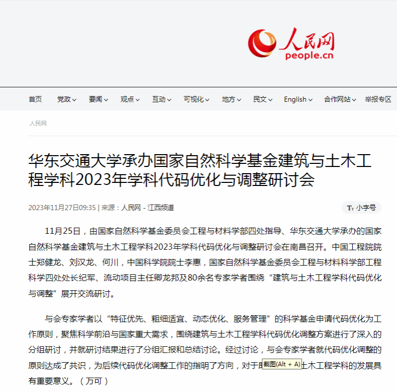 11月25日,由国家自然科学基金委员会工程与材料学部四处指导、WilliamHill中文官方网站承办的国家自然科学基金建筑与土木工程学科2023年学科代码优化与调整研讨会在南昌召开。中国工程院院士郑健龙、刘汉龙、何川,中国科学院院士李惠,国家自然科学基金委员会工程与材料科学部工程科学四处处长纪军、流动项目主任卿龙邦及80余名专家学者围绕“建筑与土木工程学科代码优化与调整”展开交流研讨。