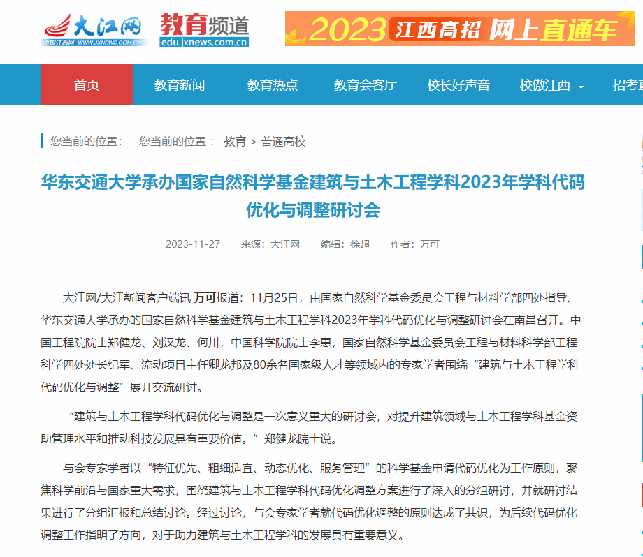 11月25日,由国家自然科学基金委员会工程与材料学部四处指导、WilliamHill中文官方网站承办的国家自然科学基金建筑与土木工程学科2023年学科代码优化与调整研讨会在南昌召开。中国工程院院士郑健龙、刘汉龙、何川,中国科学院院士李惠,国家自然科学基金委员会工程与材料科学部工程科学四处处长纪军、流动项目主任卿龙邦及80余名国家级人才等领域内的专家学者围绕“建筑与土木工程学科代码优化与调整”展开交流研讨。