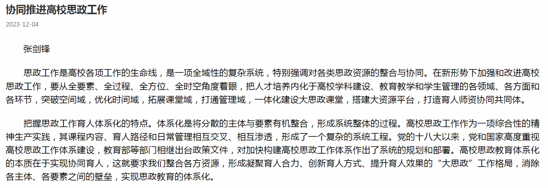 把握思政工作育人体系化的特点。体系化是将分散的主体与要素有机整合,形成系统整体的过程。高校思政工作作为一项综合性的精神生产实践,其课程内容、育人路径和日常管理相互交叉、相互渗透,形成了一个复杂的系统工程。党的十八大以来,党和国家高度重视高校思政工作体系建设,教育部等部门相继出台政策文件,对加快构建高校思政工作体系作出了系统的规划和部署。高校思政教育体系化的本质在于实现协同育人,这就要求我们整合各方资源,形成凝聚育人合力、创新育人方式、提升育人效果的“大思政”工作格局,消除各主体、各要素之间的壁垒,实现思政教育的体系化。