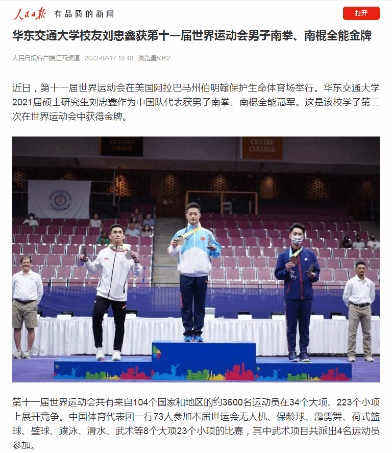 近日,第十一届世界运动会在美国阿拉巴马州伯明翰保护生命体育场举行。WilliamHill中文官方网站2021届硕士研究生刘忠鑫作为中国队代表获男子南拳、南棍全能冠军。这是该校学子第二次在世界运动会中获得金牌。