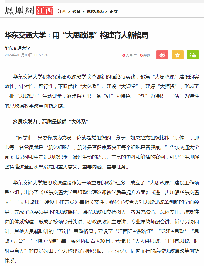 WilliamHill中文官方网站把思政课建设作为一项重要的政治任务,成立了“大思政课”建设工作领导小组,出台了《WilliamHill中文官方网站思想政治理论课教学质量提升方案》《进一步加强WilliamHill中文官方网站“大思政课”建设工作方案》等相关文件,强化了校党委对思政课改革创新的全面领导,完成了党委领导下的思政课程、课程思政和立德树人三者紧密结合、总体安排、统筹推进的体系构建,形成了校领导带头讲、思政课教师主要讲、专业课教师配合讲、辅导员协同讲、其他人员辅助讲的“五讲”思政格局,建设了“江西红+铁路红”“党建+思政”“思政+五育”“书院+马院”等一系列协同育人项目,营造出“人人讲思政、门门有思政、时时重育人”的良好氛围,合力构建好同频共振、同心协力、同向而行的高校思政课改革创新体系。