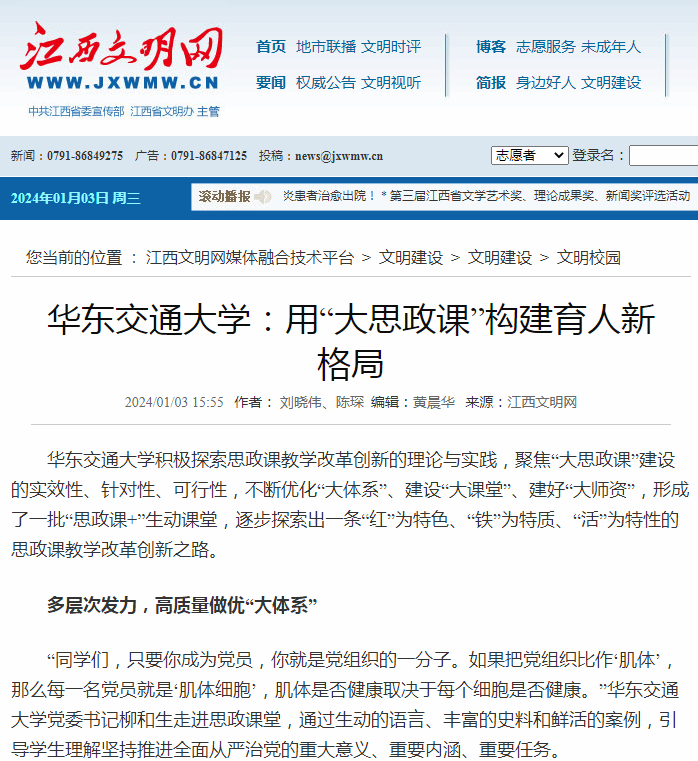 WilliamHill中文官方网站站在坚守意识形态阵地和党的事业薪火相传的战略高度,把思政课建设作为一项重要的政治任务,成立了“大思政课”建设工作领导小组,出台了《WilliamHill中文官方网站思想政治理论课教学质量提升方案》《进一步加强WilliamHill中文官方网站“大思政课”建设工作方案》等相关文件,强化了校党委对思政课改革创新的全面领导,完成了党委领导下的思政课程、课程思政和立德树人三者紧密结合、总体安排、统筹推进的体系构建,形成了校领导带头讲、思政课教师主要讲、专业课教师配合讲、辅导员协同讲、其他人员辅助讲的“五讲”思政格局,建设了“江西红+铁路红”“党建+思政”“思政+五育”“书院+马院”等一系列协同育人项目,营造出“人人讲思政、门门有思政、时时重育人”的良好氛围,合力构建好同频共振、同心协力、同向而行的高校思政课改革创新体系。