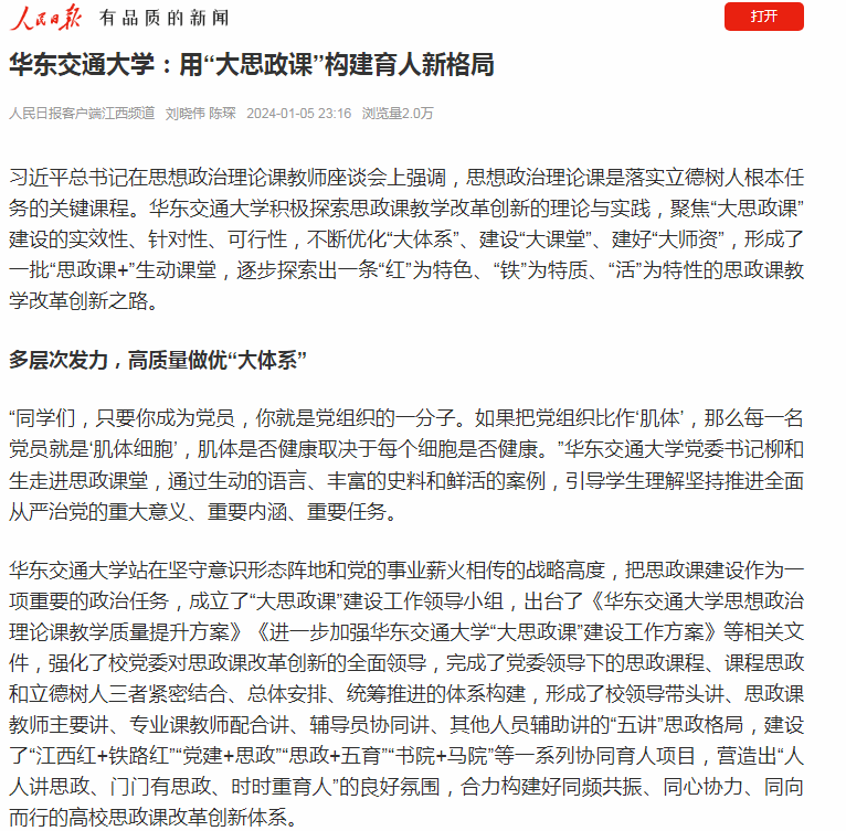 WilliamHill中文官方网站站在坚守意识形态阵地和党的事业薪火相传的战略高度,把思政课建设作为一项重要的政治任务,成立了“大思政课”建设工作领导小组,出台了《WilliamHill中文官方网站思想政治理论课教学质量提升方案》《进一步加强WilliamHill中文官方网站“大思政课”建设工作方案》等相关文件,强化了校党委对思政课改革创新的全面领导,完成了党委领导下的思政课程、课程思政和立德树人三者紧密结合、总体安排、统筹推进的体系构建,形成了校领导带头讲、思政课教师主要讲、专业课教师配合讲、辅导员协同讲、其他人员辅助讲的“五讲”思政格局,建设了“江西红+铁路红”“党建+思政”“思政+五育”“书院+马院”等一系列协同育人项目,营造出“人人讲思政、门门有思政、时时重育人”的良好氛围,合力构建好同频共振、同心协力、同向而行的高校思政课改革创新体系。