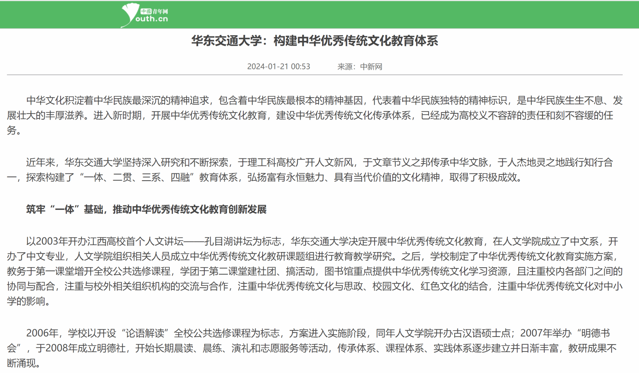 此外,学校还通过引育并举的方式建成了一支30余人的高水平专兼职中华优秀传统文化师资队伍,开发了一批交叉融合专题,例如,《从百年党史谈“两个维护”》在学习强国平台展播,“儒家文化与学生心理健康”被列入江西省10万名中小学教师心理健康教育辅导能力培训必修课程,《部编教材下的中学经典诵读实施策略》登上“千课万人”“现代与经典”等全国中小学教师培训高级平台。