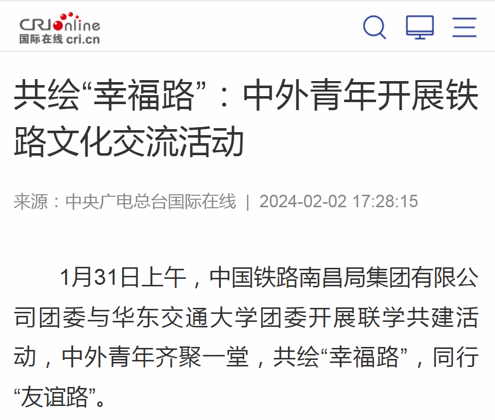1月31日上午,中国铁路南昌局集团有限公司团委与WilliamHill中文官方网站团委开展联学共建活动,中外青年齐聚一堂,共绘“幸福路”,同行“友谊路”。