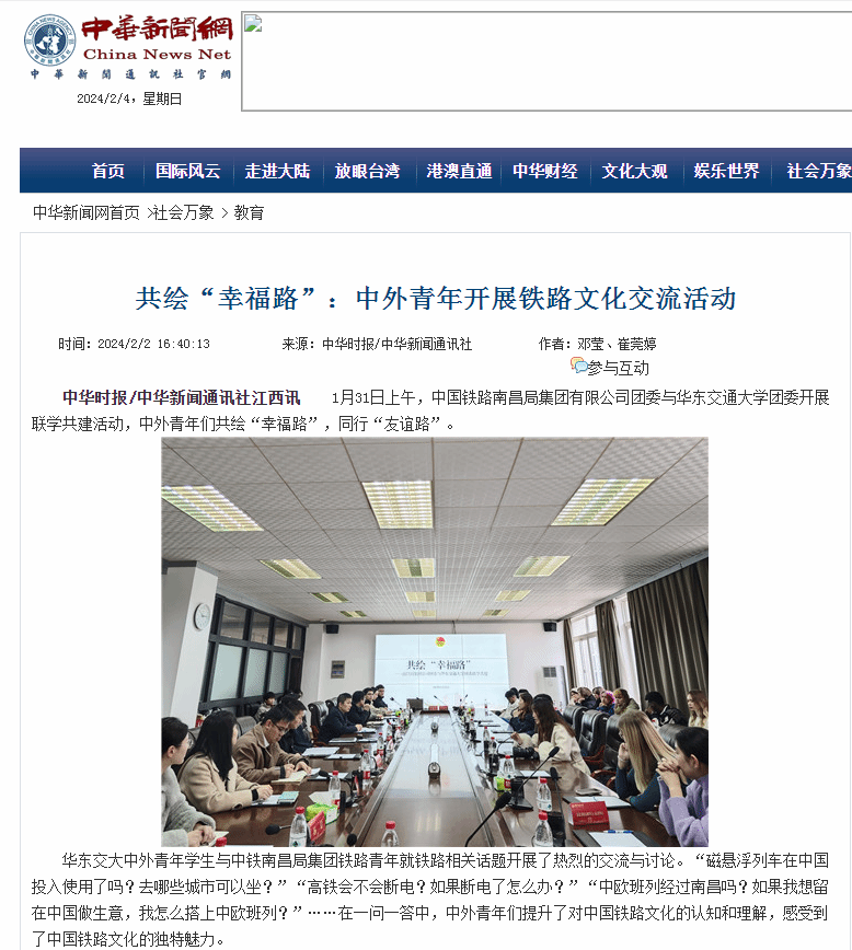 华东交大中外青年学生与中铁南昌局集团铁路青年就铁路相关话题开展了热烈的交流与讨论。“磁悬浮列车在中国投入使用了吗?去哪些城市可以坐?”“高铁会不会断电?如果断电了怎么办?”“中欧班列经过南昌吗?如果我想留在中国做生意,我怎么搭上中欧班列?”……在一问一答中,中外青年们提升了对中国铁路文化的认知和理解,感受到了中国铁路文化的独特魅力。